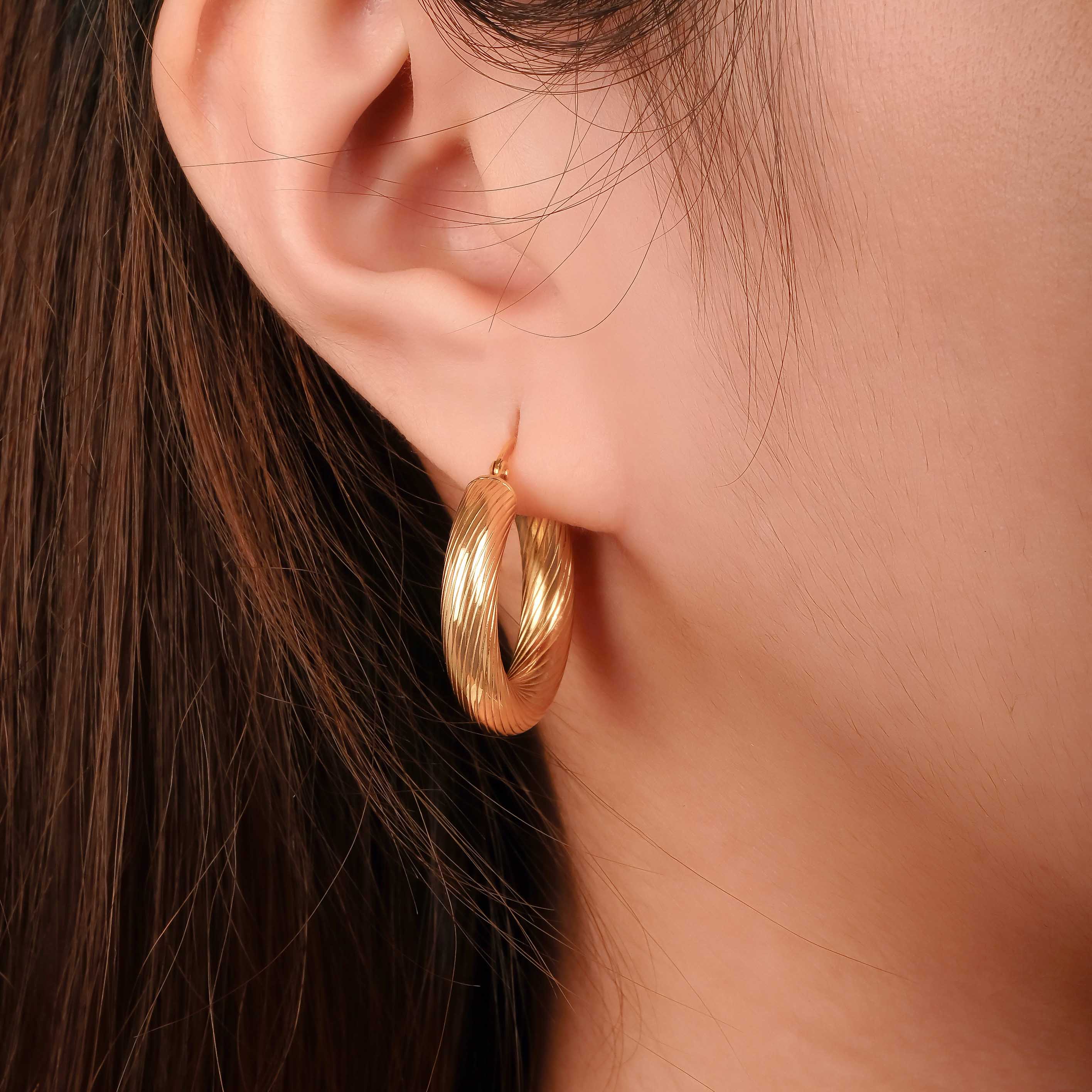Price range: ₱22,900.00 through ₱29,500.00Textured hoop earrings in hollow 18K Italian yellow gold by Oro Galleria Fine Jewelry. -